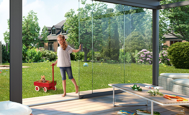 Die Bedienung ist kinderleicht: Die Glaselemente lassen sich ohne viel Kraft bewegen. So kann die offene Terrasse jederzeit zu einem geschlossenen Wintergarten umgerüstet werden.