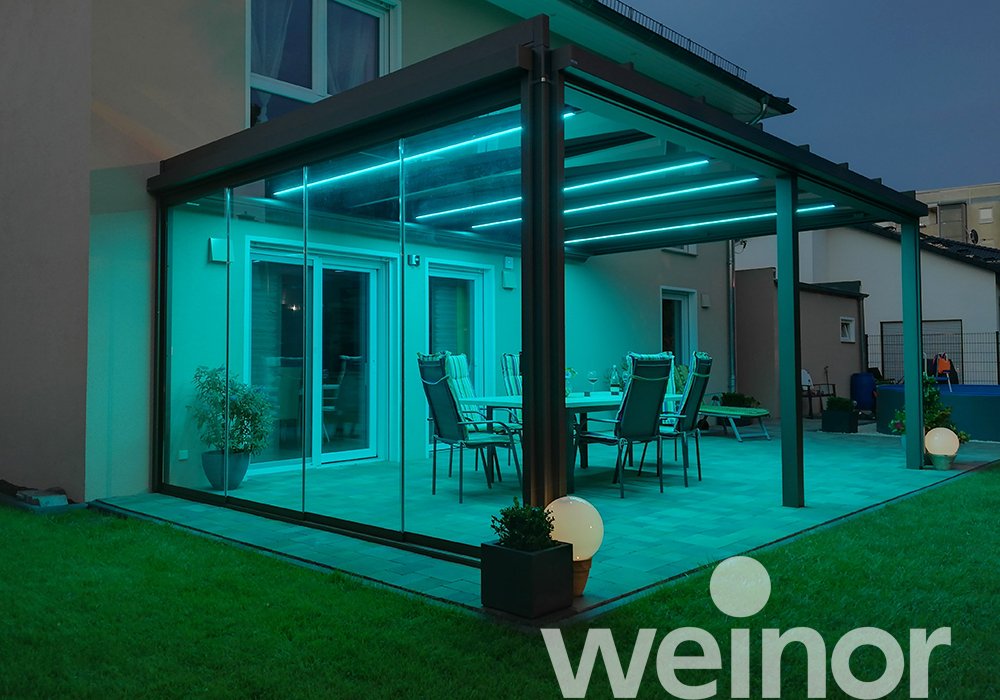 Stimmungsvolle Atmosphäre zu jeder Uhrzeit schafft die richtige Beleuchtung für Deine Terrassenüberachung.