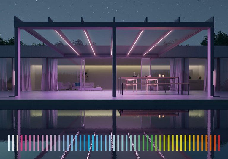 Terrassenüberdachung mit variabler LED-Beleuchtung an den Dachbalken