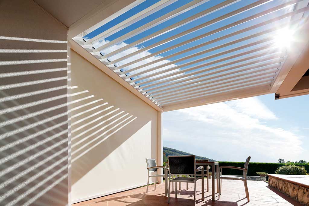 Terrassendach mit halb geöffneten Lamellen bei Sonnenschein